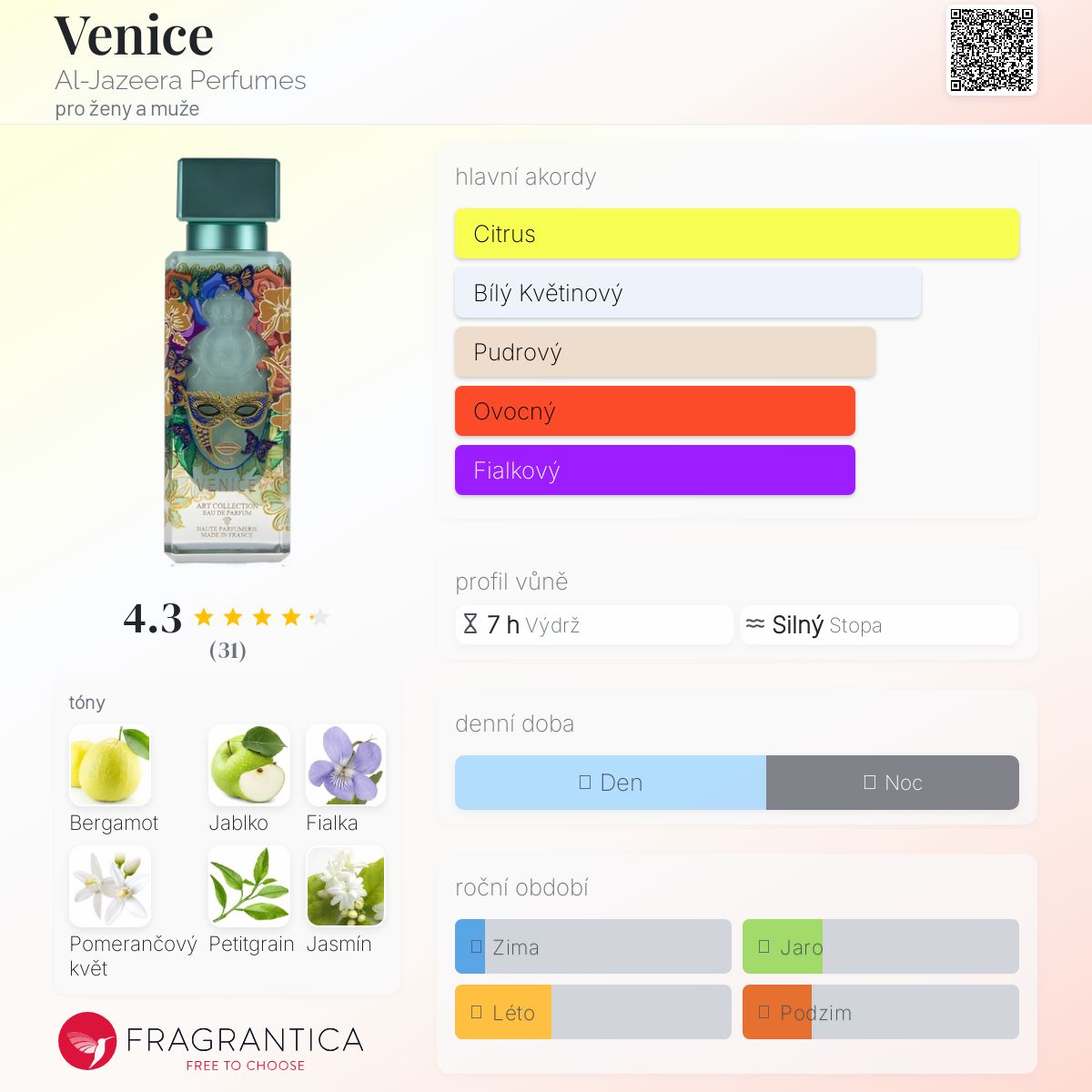Venice podle Al-Jazeera Perfumes je Orientální Woody vůně pro ženy a muže. Venice byl/a uveden/a v roce 2019. "Nosem" za touto vůní je Dominique Ropion. Vrchní tóny jsou Bergamot, Jablko a Petitgrain; střední tóny jsouFialka, Pomerančový květ a Jasmín ; základní tóny jsou Pižmo, Jantarové dřevo a Vanilka.