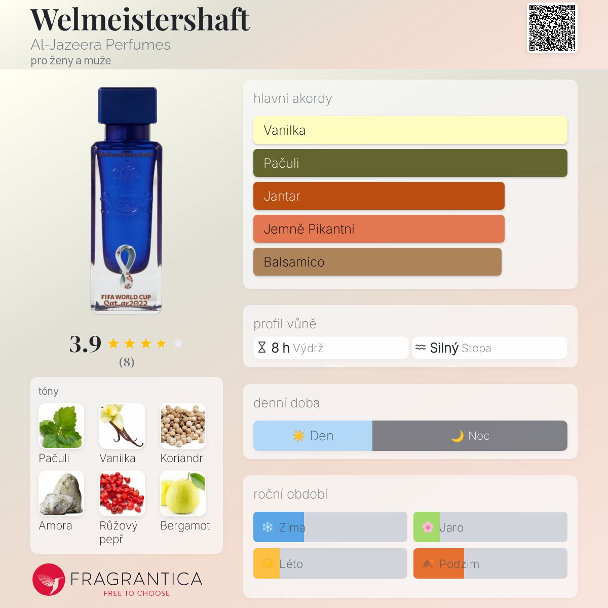 Welmeistershaft podle Al-Jazeera Perfumes je Orientální Woody vůně pro ženy a muže. Welmeistershaft byl/a uveden/a v roce 2022. "Nosem" za touto vůní je Juliette Karagueuzoglou. Vrchní tóny jsou Koriandr, Růžový pepř a Bergamot; střední tóny jsouRůže, Konvalinka a Fialkový list ; základní tóny jsou Pačuli, Vanilka a Ambra.