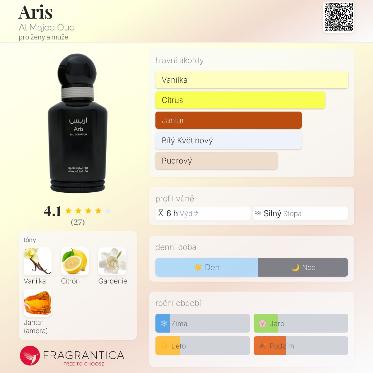 Aris podle Al Majed Oud je Orientální vůně pro ženy a muže. Toto je nová vůně. Aris byl/a uveden/a v roce 2024. Vrchní tón je Citrón ; střední tón jeGardénie ; základní tóny jsou Vanilka a Jantar (ambra).