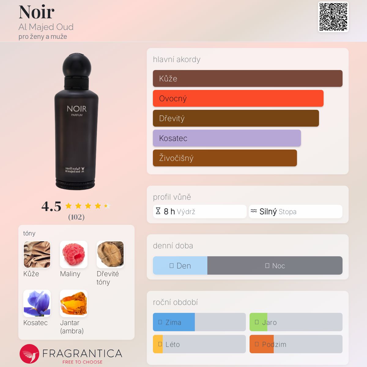 Noir podle Al Majed Oud je Leather vůně pro ženy a muže. Toto je nová vůně. Noir byl/a uveden/a v roce 2024. "Nosem" za touto vůní je Margherita Carini. Vrchní tón je Maliny ; střední tón jeKosatec ; základní tóny jsou Kůže, Dřevité tóny a Jantar (ambra).