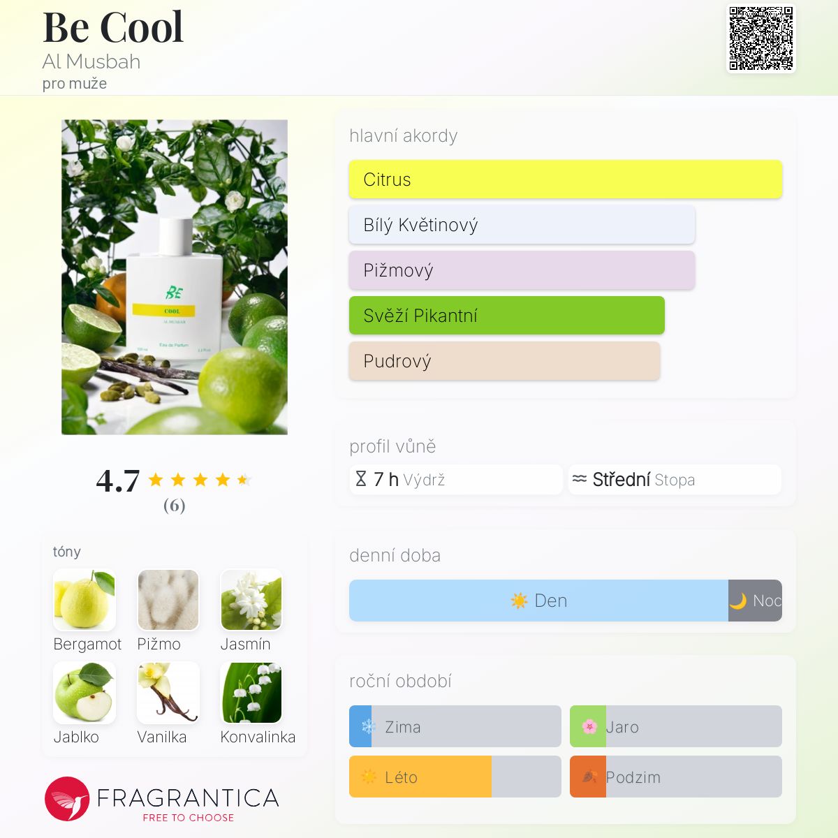 Be Cool podle Al Musbah je Aromatic Spicy vůně pro muže. Be Cool byl/a uveden/a v roce 2016. Vrchní tóny jsou Bergamot a Jablko; střední tóny jsouJasmín a Konvalinka ; základní tóny jsou Pižmo, Vanilka a Kardamom.
