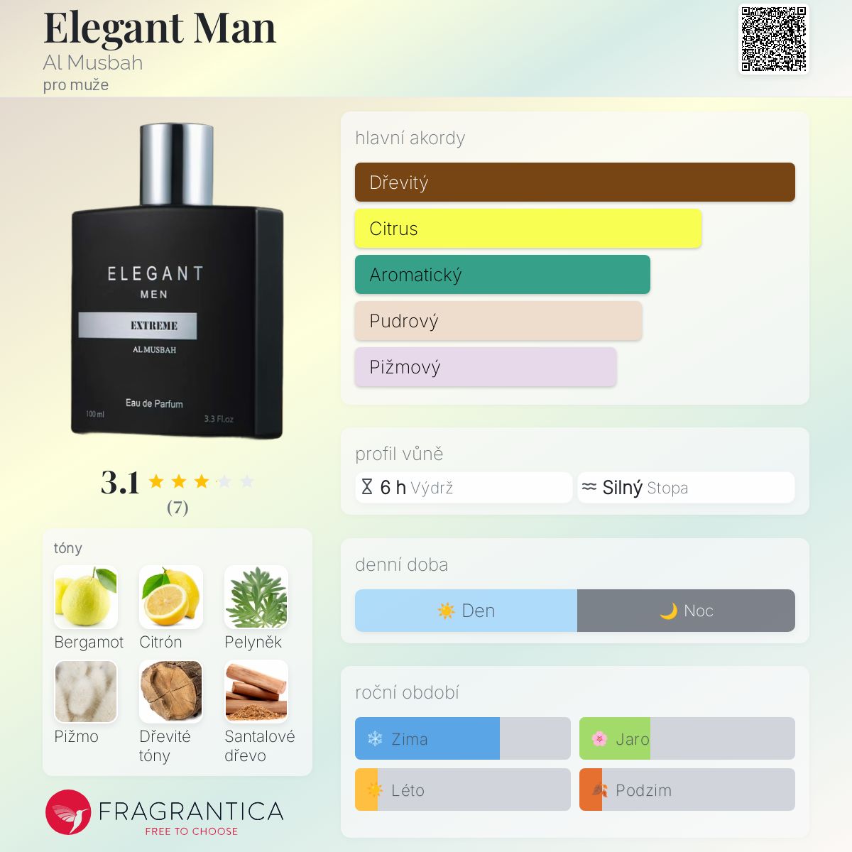Elegant Man podle Al Musbah je Woody Floral Musk vůně pro muže. Elegant Man byl/a uveden/a v roce 2014. Vrchní tóny jsou Bergamot a Citrón; střední tón jePelyněk ; základní tóny jsou Pižmo, Dřevité tóny, Santalové dřevo a Cedr.