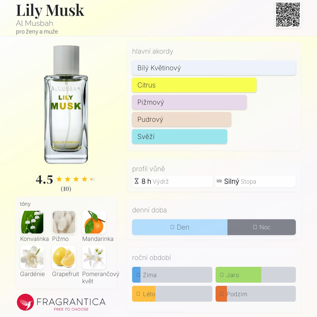 Lily Musk podle Al Musbah je Floral Woody Musk vůně pro ženy a muže. Lily Musk byl/a uveden/a v roce 2017. Vrchní tóny jsou Konvalinka, Mandarinka a Grapefruit; střední tóny jsouGardénie, Pomerančový květ a Med ; základní tóny jsou Bílé pižmo, Santalové dřevo a Mandle.