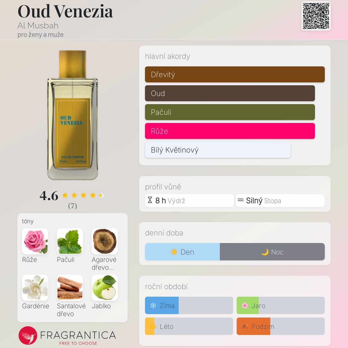 Oud Venezia podle Al Musbah je Orientální Floral vůně pro ženy a muže. Oud Venezia byl/a uveden/a v roce 2019. Vrchní tón je Jablko ; střední tóny jsouRůže a Gardénie ; základní tóny jsou Pačuli, Agarové dřevo (oud), Santalové dřevo a Jablko.