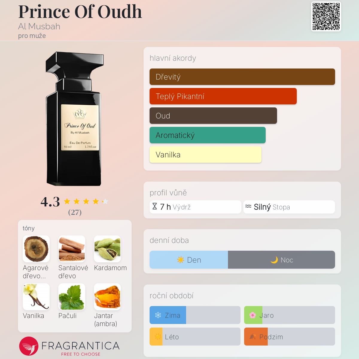 Prince Of Oudh podle Al Musbah je Orientální Vanilla vůně pro muže. Vrchní tóny jsou Kardamom a Pepř; střední tóny jsouAgarové dřevo (oud), Santalové dřevo, Vetiver, Ylang-Ylang, Lotus a Květinové ovocné tóny ; základní tóny jsou Agarové dřevo (oud), Vanilka, Pačuli, Jantar (ambra), Dřevité tóny a Fazole tonka.