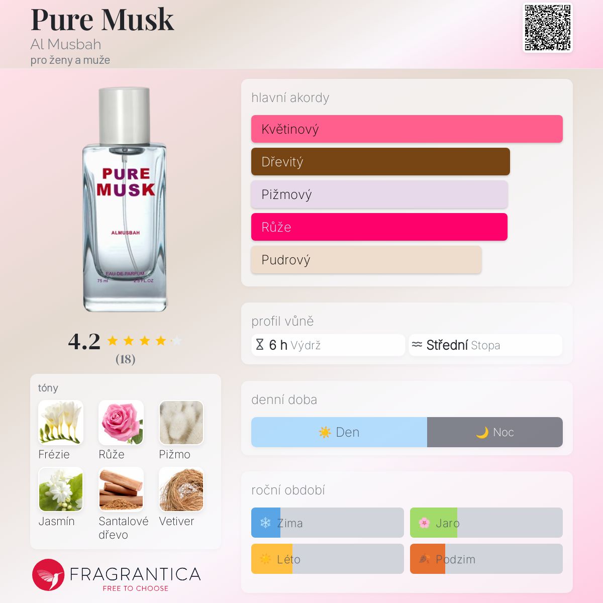 Pure Musk podle Al Musbah je Floral Woody Musk vůně pro ženy a muže. Pure Musk byl/a uveden/a v roce 2015. Vrchní tón je Frézie ; střední tóny jsouRůže a Jasmín ; základní tóny jsou Bílé pižmo, Santalové dřevo a Vetiver.