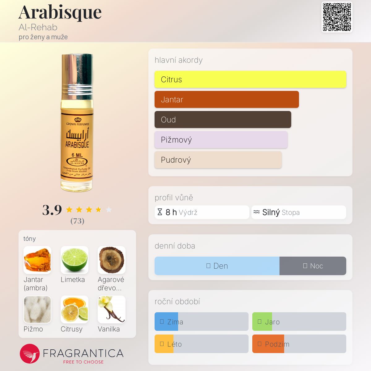Arabisque podle Al-Rehab je Orientální vůně pro ženy a muže. Vrchní tóny jsou Limetka a Vanilka; střední tóny jsouCitrusy, Tuberóza a Koriandr ; základní tóny jsou Bílý jantar (ambra), Agarové dřevo (oud) a Pižmo.