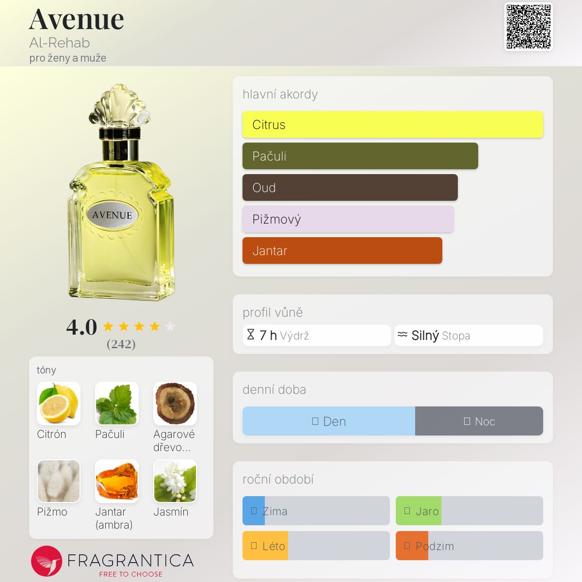 Avenue podle Al-Rehab je vůně pro ženy a muže. Avenue byl/a uveden/a v roce 2014. Vrchní tóny jsou Pačuli a Agarové dřevo (oud); střední tóny jsouCitrón, Jasmín a Vanilka ; základní tóny jsou Pižmo, Jantar (ambra) a Fazole tonka.