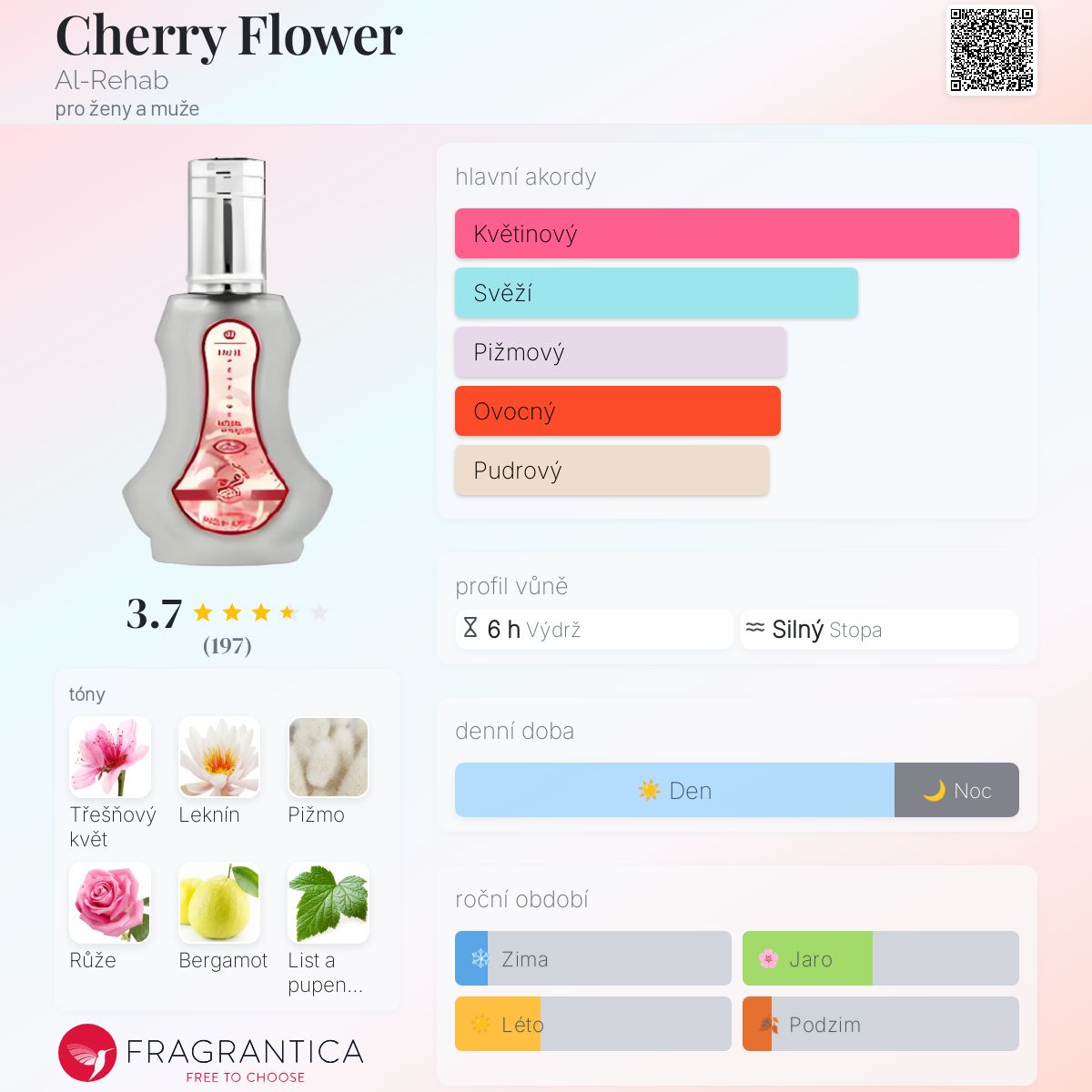 Cherry Flower podle Al-Rehab je Floral Green vůně pro ženy a muže. Vrchní tóny jsou Bergamot a Poupata rybízu; střední tóny jsouTřešňový květ, Leknín a Čajová růže ; základní tóny jsou Bílé pižmo, Kořen orris a Vetiver.