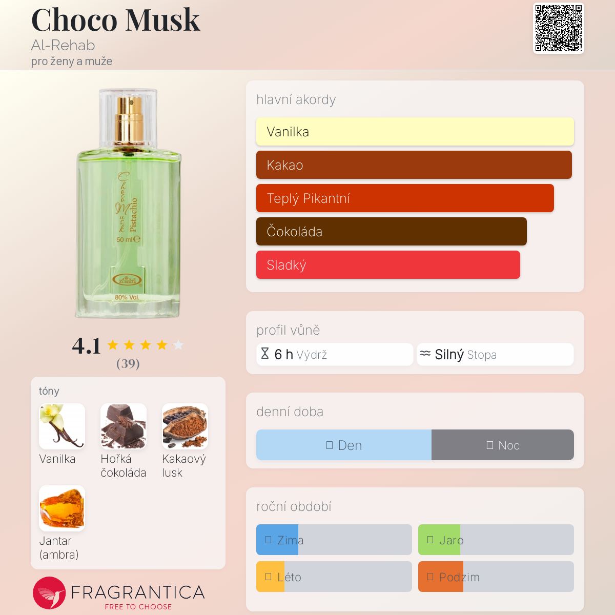 Choco Musk podle Al-Rehab je Orientální Vanilla vůně pro ženy a muže. Toto je nová vůně. Choco Musk byl/a uveden/a v roce 2025. Vrchní tón je Jantar (ambra) ; střední tón jeVanilka ; základní tóny jsou Čokoláda a Kakao.