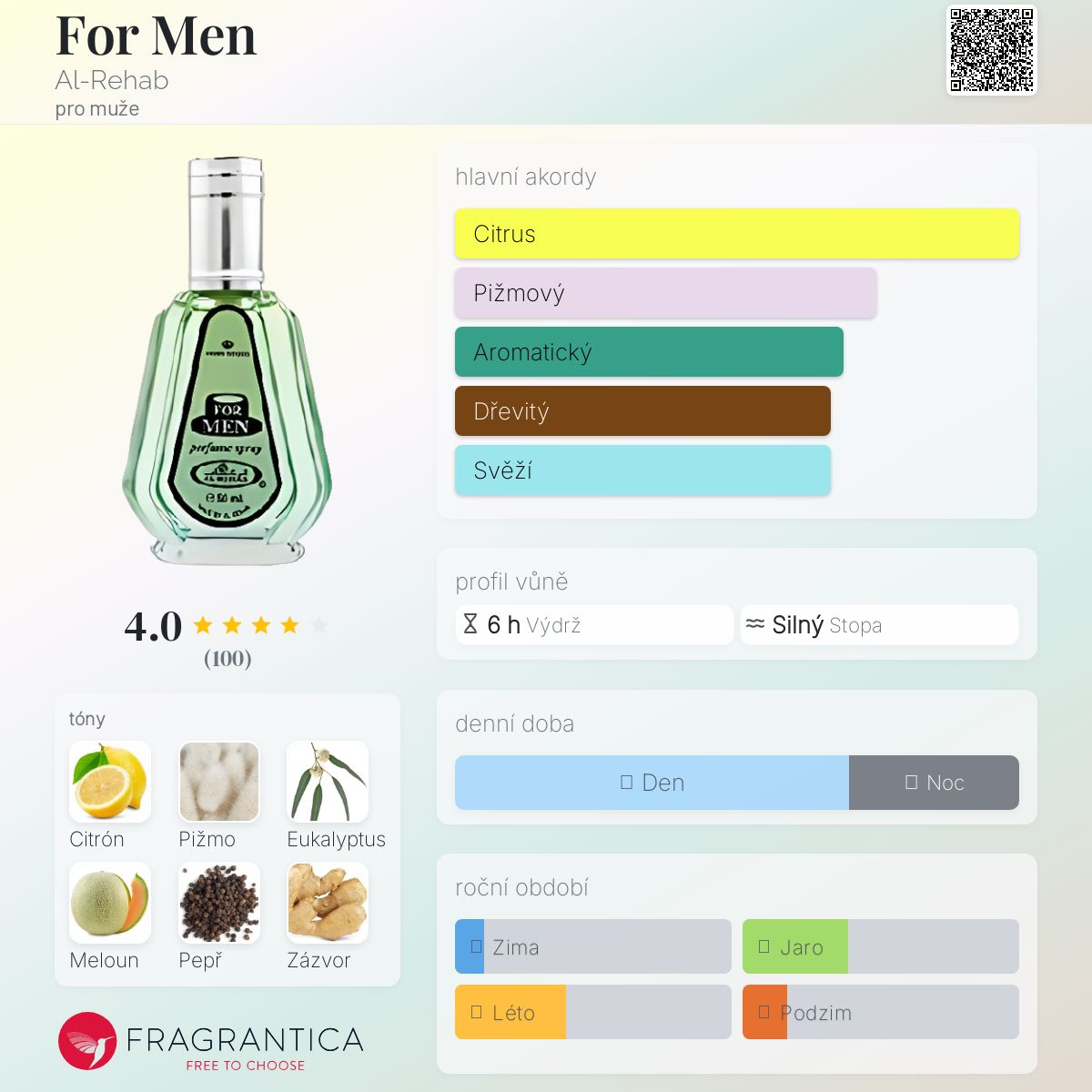 For Men podle Al-Rehab je Woody Spicy vůně pro muže. Vrchní tóny jsou Citrón, Eukalyptus, Meloun a Kardamom; střední tóny jsouČerný pepř, Zázvor a Skořice ; základní tóny jsou Pižmo, Pryskyřice a Santalové dřevo.