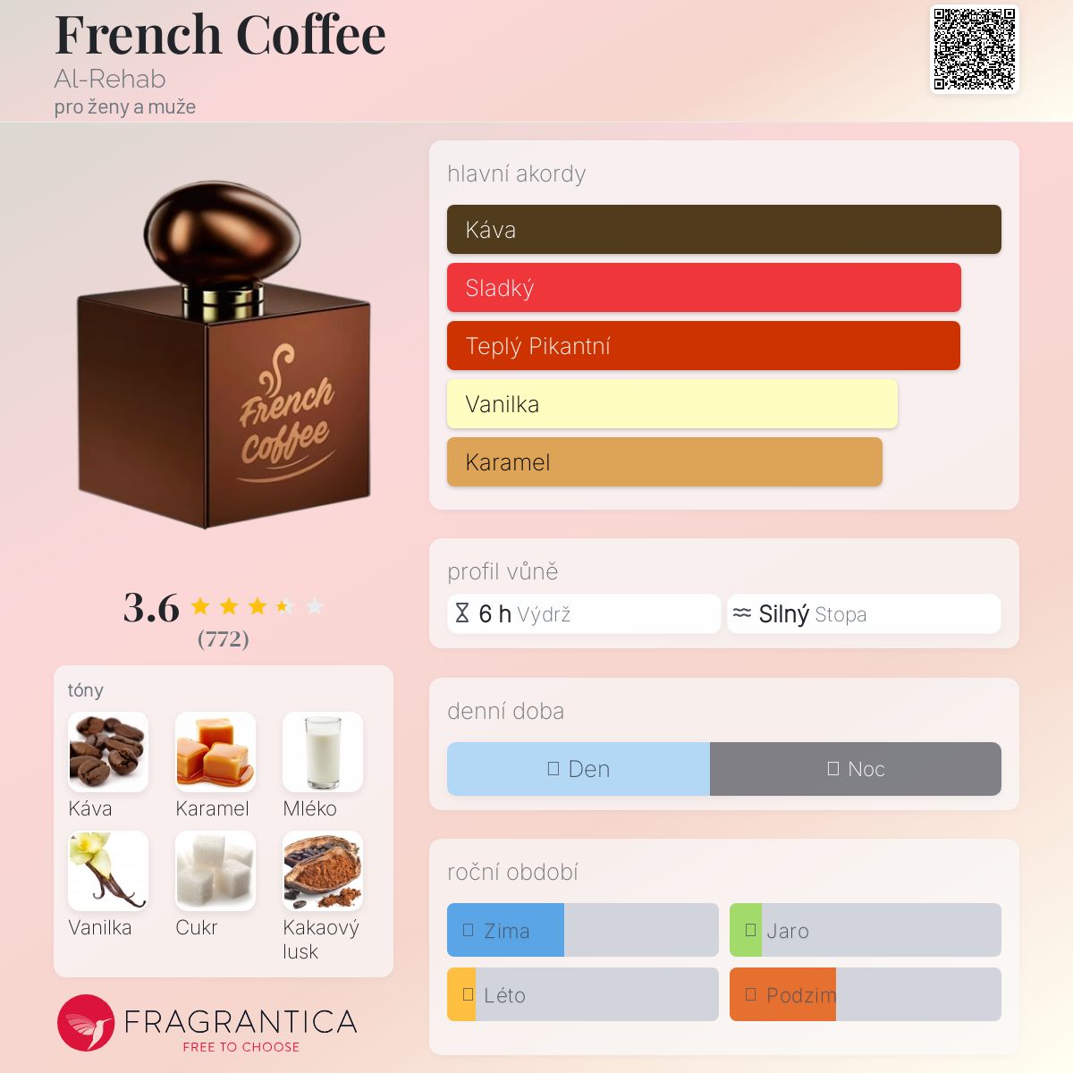 Velmi realistická vůně kávy. Voní, jako byste vstoupili do kavárny a objednali si karamelové latté s extra dávkou espressa. Super lahodná a realistická. Na kůži a oblečení vydrží tak dlouho (tak 8+ hodin)... dobře se promítá asi 3 hodiny a zanechává krásnou vonnou stopu po celé hodiny. French Coffee je opravdu skrytý klenot