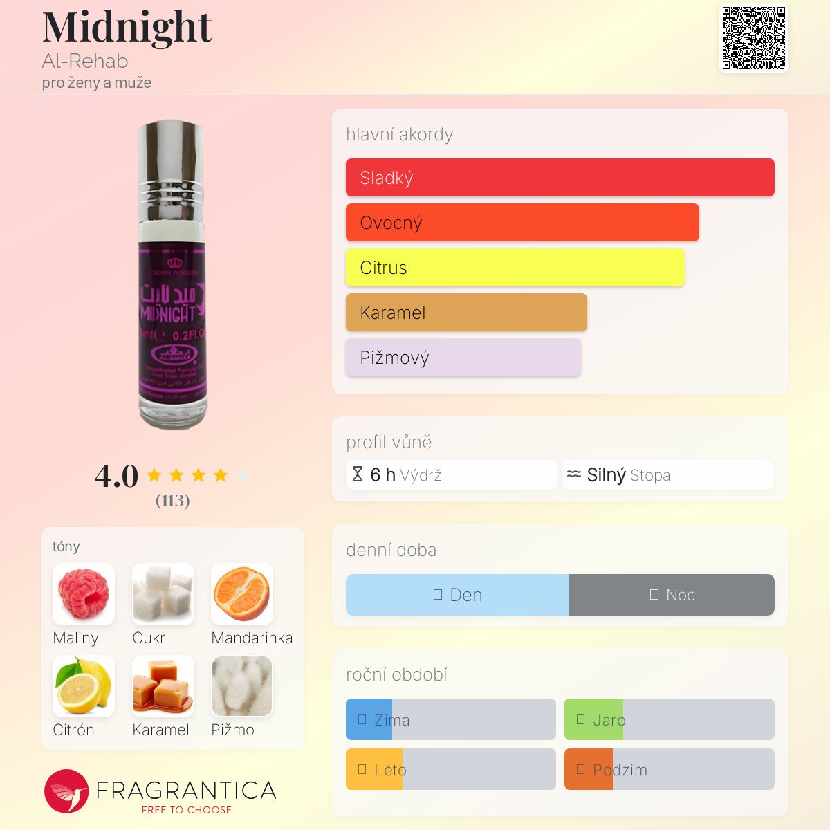Midnight podle Al-Rehab je Orientální vůně pro ženy a muže. Midnight byl/a uveden/a v roce 2019. Vrchní tóny jsou Mandarinka a Citrón; střední tóny jsouMaliny a Pižmo ; základní tóny jsou Cukr, Karamel a Lotus.
