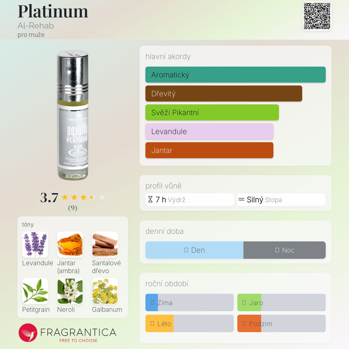 Platinum podle Al-Rehab je Woody Aromatic vůně pro muže. Platinum byl/a uveden/a v roce 2015. Vrchní tóny jsou Levandule, Petitgrain, Neroli a Rozmarýn; střední tóny jsouGalbanum, Jasmín, Šalvěj muškátová a Pelargónie ; základní tóny jsou Jantar (ambra), Santalové dřevo, Dubový mech, Cedr a Vetiver.