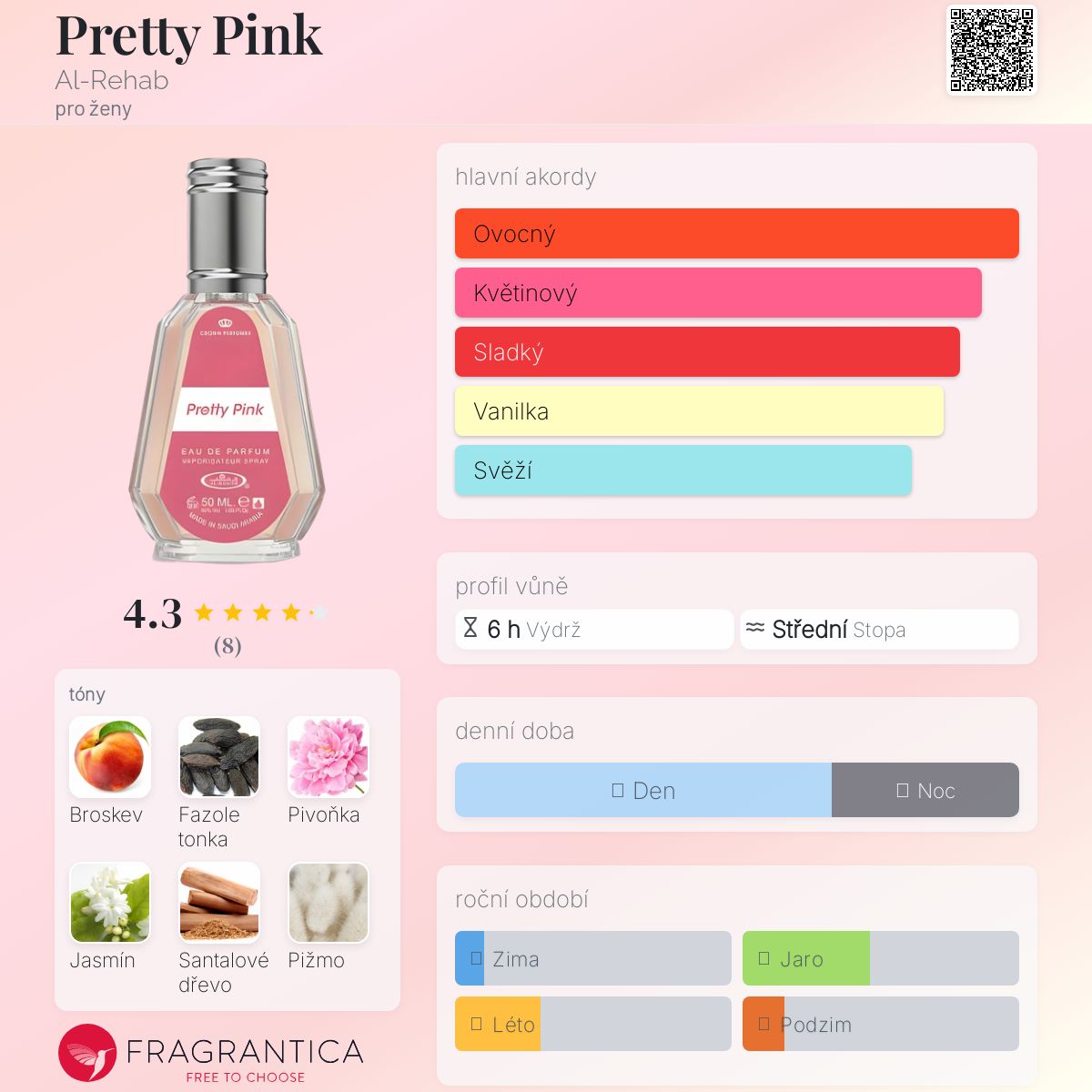 Pretty Pink podle Al-Rehab je Floral vůně pro ženy. Pretty Pink byl/a uveden/a v roce 2022. Vrchní tóny jsou Broskev a Pivoňka; střední tóny jsouJasmín a Bílé pižmo ; základní tóny jsou Fazole tonka a Santalové dřevo.