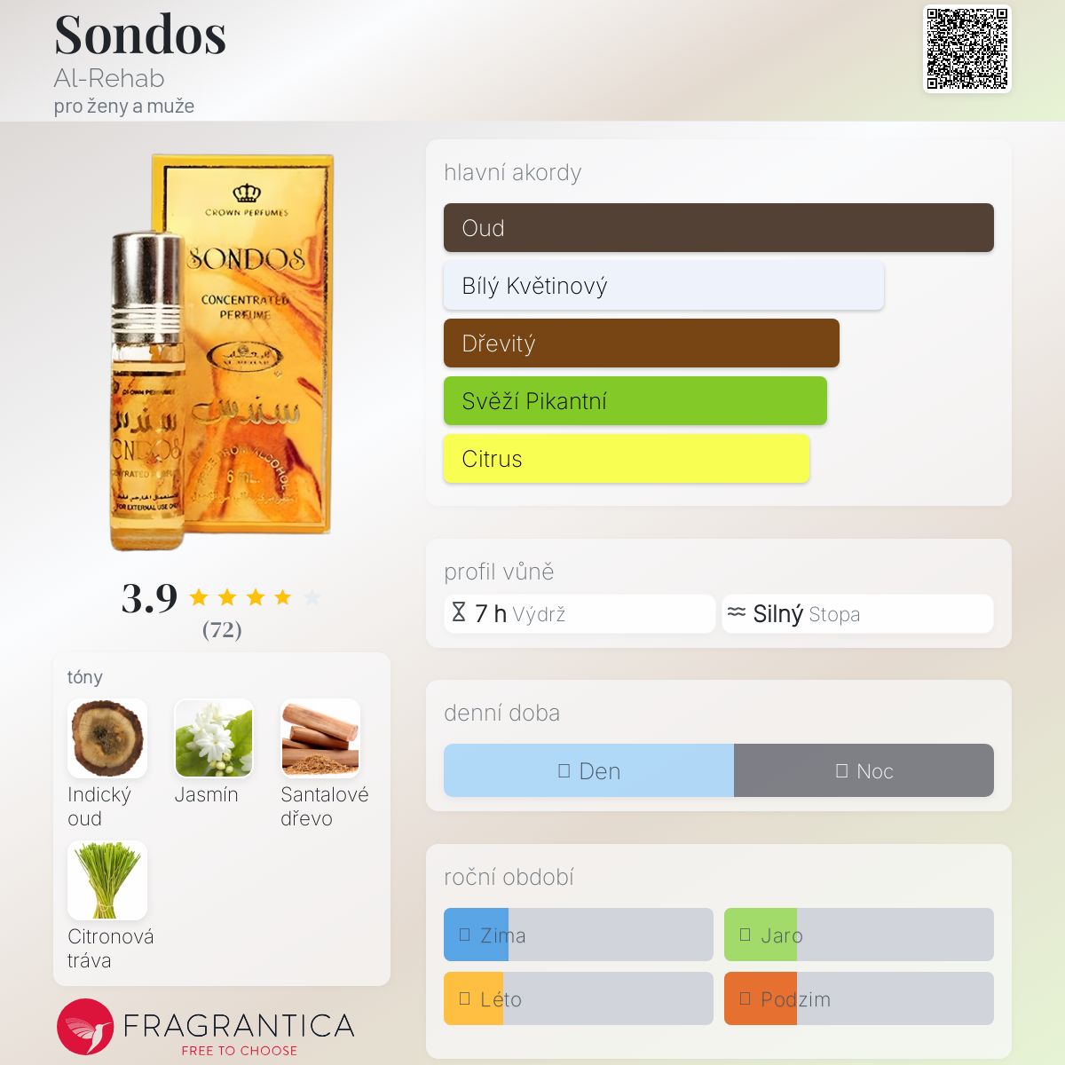 Sondos podle Al-Rehab je Orientální vůně pro ženy a muže. Sondos byl/a uveden/a v roce 2011. Vrchní tón je Citronová tráva ; střední tón jeJasmín ; základní tóny jsou Indický oud a Santalové dřevo.