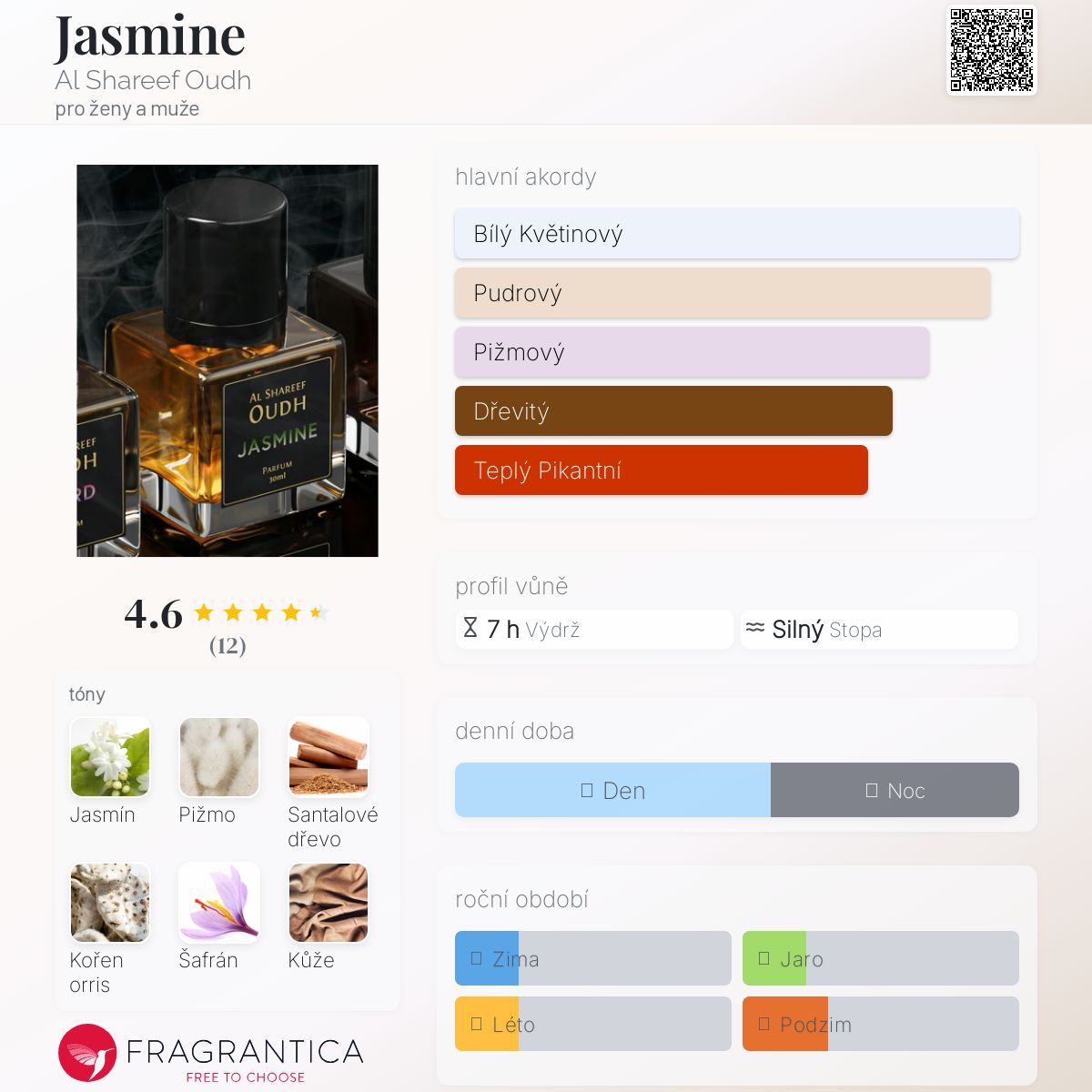 Jasmine podle Al Shareef Oudh je vůně pro ženy a muže. Jasmine byl/a uveden/a v roce 2021. "Nosem" za touto vůní je Al Shareef Jawed. Vrchní tón je Jasmín ; střední tóny jsouPižmo, Kořen orris a Šafrán ; základní tóny jsou Santalové dřevo a Kůže.