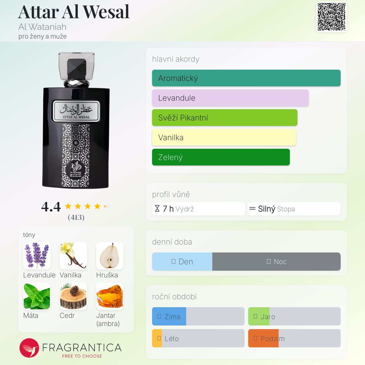 Attar Al Wesal podle Al Wataniah je Orientální Spicy vůně pro ženy a muže. Attar Al Wesal byl/a uveden/a v roce 2020. Vrchní tóny jsou Levandule, Hruška, Máta, Bergamot a Citrón; střední tóny jsouSkořice, Šalvěj muškátová a Kmín ; základní tóny jsou Černý vanilkový lusk, Cedr, Jantar (ambra) a Pačuli.