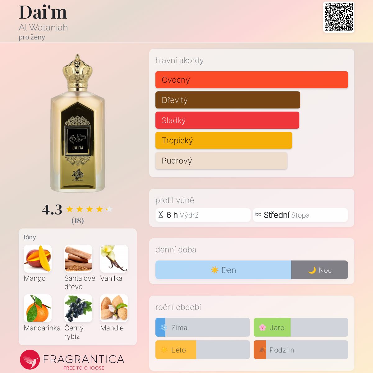 Dai'm podle Al Wataniah je Floral Fruity vůně pro ženy. Dai'm byl/a uveden/a v roce 2023. Vrchní tóny jsou Mango, Mandarinka a Černý rybíz; střední tóny jsouMandle, Jasmín a Růže ; základní tóny jsou Santalové dřevo, Vanilka a Pižmo.