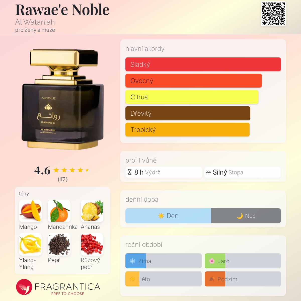 Rawae'e Noble podle Al Wataniah je Orientální Woody vůně pro ženy a muže. Rawae'e Noble byl/a uveden/a v roce 2021. Vrchní tóny jsou Mandarinka, Černý pepř, Růžový pepř, Bergamot a Šafrán; střední tóny jsouMango, Ananas, Ylang-Ylang a Pomerančový květ ; základní tóny jsou Koňak, Cedr, Pačuli a Jantar (ambra).