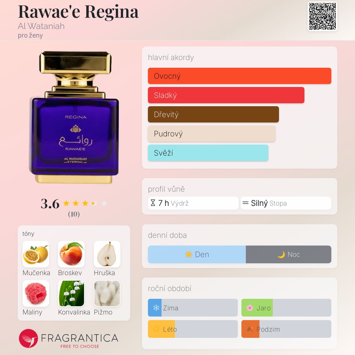 Rawae'e Regina podle Al Wataniah je Floral vůně pro ženy. Rawae'e Regina byl/a uveden/a v roce 2021. Vrchní tóny jsou Mučenka, Broskev, Hruška a Maliny; střední tón jeKonvalinka ; základní tóny jsou Pižmo, Santalové dřevo, Vanilka a Pačuli.