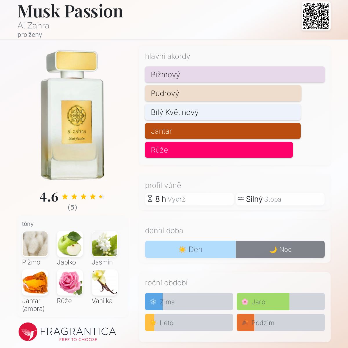Musk Passion podle Al Zahra je Floral Woody Musk vůně pro ženy. Musk Passion byl/a uveden/a v roce 2016. Vrchní tón je Zelené jablko ; střední tóny jsouJasmín a Růže ; základní tóny jsou Pižmo, Jantar (ambra) a Vanilka.