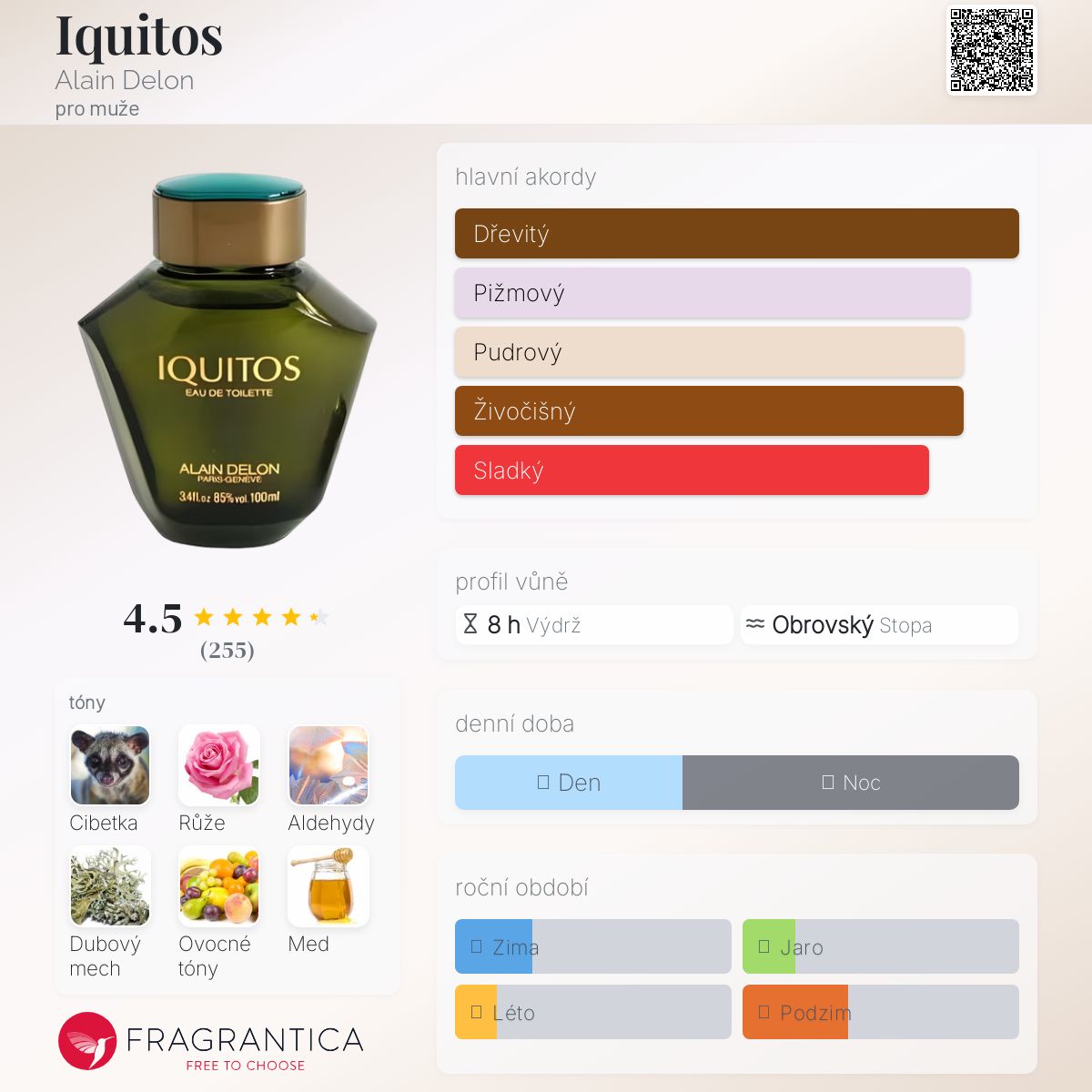 Iquitos podle Alain Delon je Woody Chypre vůně pro muže. Iquitos byl/a uveden/a v roce 1987. "Nosem" za touto vůní je Gerard Anthony. Vrchní tóny jsou Ovocné tóny, Zelené tóny, Koriandr, Muškátový květ, Mandarinka a Citrón; střední tóny jsouRůže, Aldehydy, Med, Jasmín, Ylang-Ylang, Konvalinka, Zázvor, Kardamom a Kořen orris ; základní tóny jsou Cibetka, Dubový mech, Kůže, Kokos, Santalové dřevo, Pačuli, Pižmo, Jantar (ambra), Vanilka, Vetiver a Cedr.