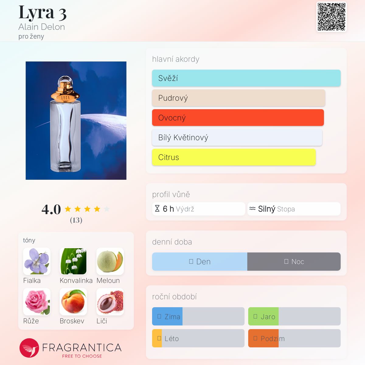 Lyra 3 podle Alain Delon je Floral Fruity vůně pro ženy. Lyra 3 byl/a uveden/a v roce 1998. Vrchní tóny jsou Konvalinka, Meloun, Mandarinka a Citrusy; střední tóny jsouFialka, Růže, Broskev, Liči a Jasmín ; základní tóny jsou Vetiver, Vanilka, Jantar (ambra) a Santalové dřevo.