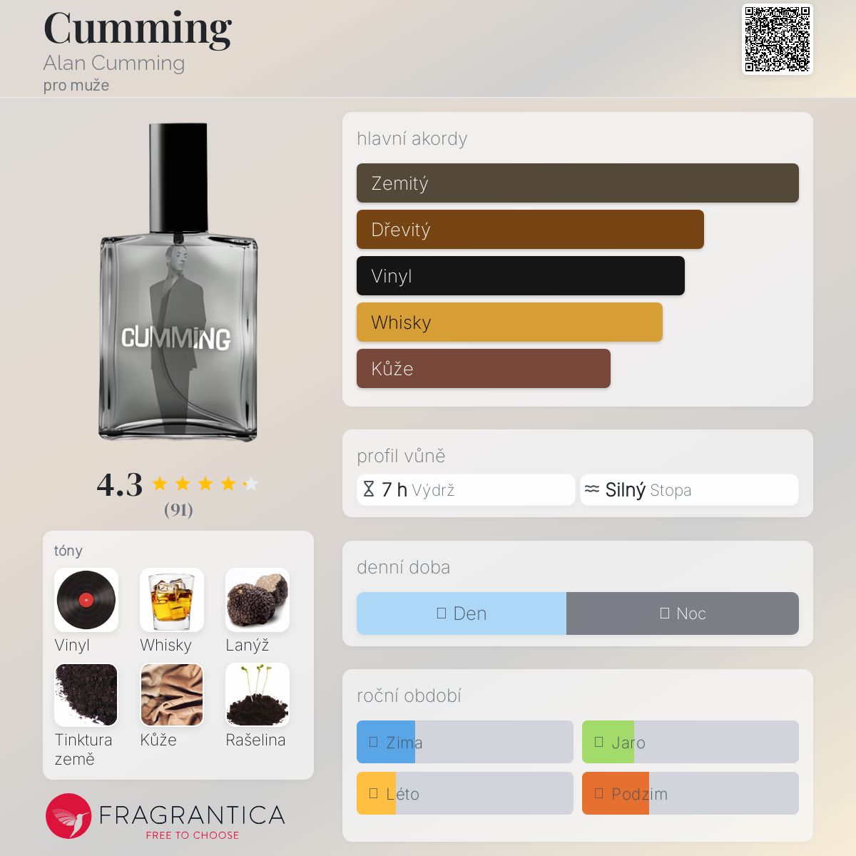 Cumming podle Alan Cumming je Aromatic Fougere vůně pro muže. Cumming byl/a uveden/a v roce 2004. "Nosem" za touto vůní je Christopher Brosius. Vrchní tóny jsou Whisky, Černý pepř, Bergamot a Borovice; střední tóny jsouVinyl, Tabák, Vřes a Jedle ; základní tóny jsou Půdní tinktura, Kůže a Rašelina.