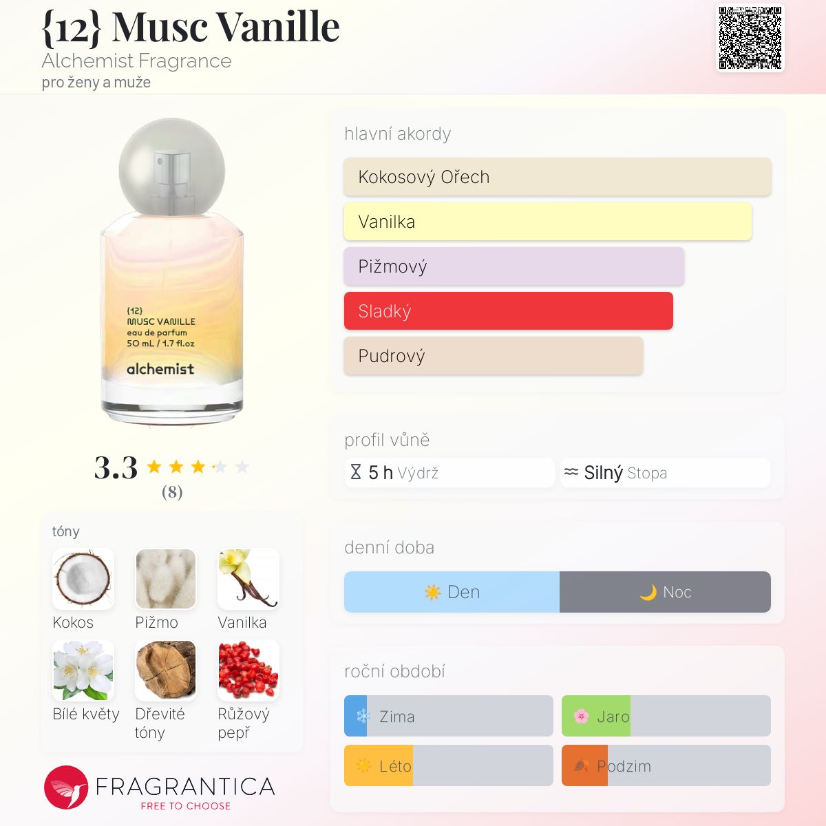 {12} Musc Vanille podle Alchemist Fragrance je Orientální Woody vůně pro ženy a muže. Toto je nová vůně. {12} Musc Vanille byl/a uveden/a v roce 2024. "Nosem" za touto vůní je Kristina Dineko. Vrchní tóny jsou Růžový pepř a Černý pepř; střední tóny jsouKokos a Bílé květy ; základní tóny jsou Bílé pižmo, Vanilka a Dřevité tóny.