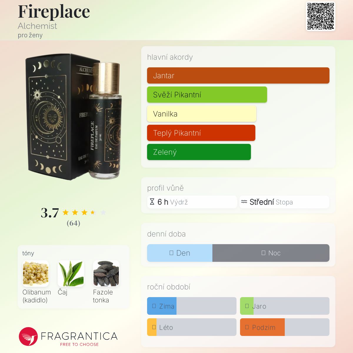 Fireplace podle Alchemist je Orientální vůně pro ženy. Fireplace byl/a uveden/a v roce 2022. Vrchní tón je Černý čaj ; střední tón jeKadidlo ; základní tón je Fazole tonka.