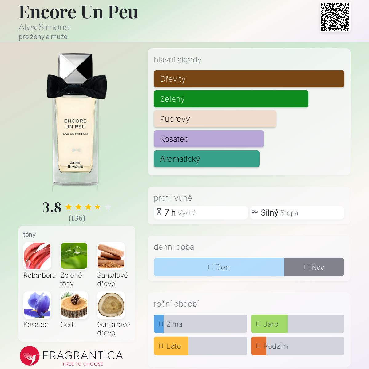 Encore Un Peu podle Alex Simone je Orientální Floral vůně pro ženy a muže. Encore Un Peu byl/a uveden/a v roce 2017. "Nosem" za touto vůní je Bertrand Duchaufour. Vrchní tóny jsou Rebarbora a Zelený tón; střední tóny jsouKosatec a Cedr ; základní tóny jsou Santalové dřevo, Guajakové dřevo a Jantarové dřevo.