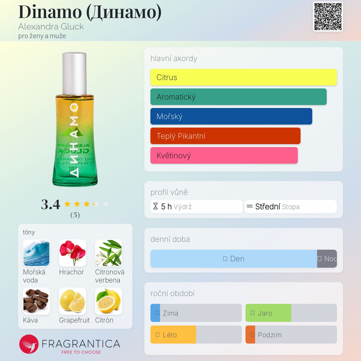 Dinamo (Динамо) podle Alexandra Gluck je vůně pro ženy a muže. Dinamo (Динамо) byl/a uveden/a v roce 2018. "Nosem" za touto vůní je Alexandra Gluck. Vrchní tóny jsou Hrachor, Citronová verbena, Grapefruit, Citrón, Vodní tóny a Ozonové tóny; střední tóny jsouFialka, Rákos, Čajová růže, Narcis a Kiwi ; základní tóny jsou Mořské tóny, Káva, Zázvor, Pačuli, Guajakové dřevo a Přesličky.
