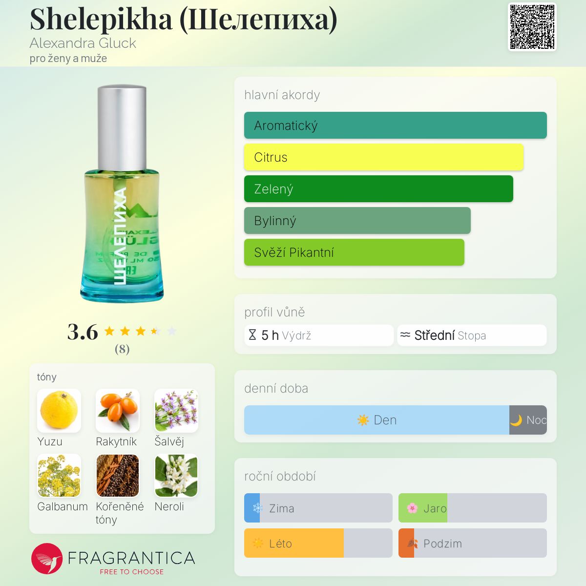 Shelepikha (Шелепиха) podle Alexandra Gluck je vůně pro ženy a muže. Shelepikha (Шелепиха) byl/a uveden/a v roce 2018. "Nosem" za touto vůní je Alexandra Gluck. Vrchní tóny jsou Yuzu a Neroli; střední tóny jsouRakytník, Galbanum a Levandule ; základní tóny jsou Šalvěj, Koření, Olibanum, Santalové dřevo, Agarové dřevo (oud), Pižmo a Jantar (ambra).