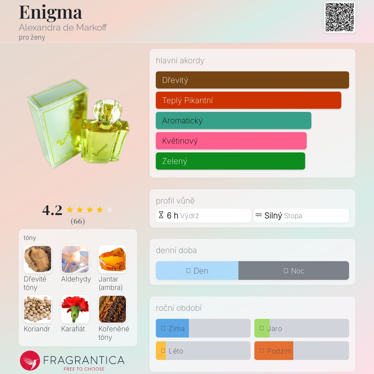 Enigma podle Alexandra de Markoff je Orientální Woody vůně pro ženy. Enigma byl/a uveden/a v roce 1972. Vrchní tóny jsou Aldehydy, Koriandr, Zelené tóny, Zelená tráva a Bergamot; střední tóny jsouKarafiát, Jasmín a Růže ; základní tóny jsou Dřevité tóny, Jantar (ambra), Koření, Dubový mech a Pačuli.