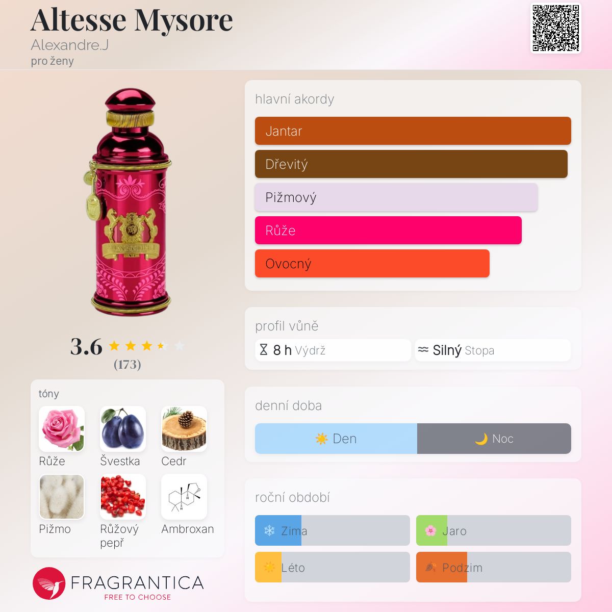 Altesse Mysore podle Alexandre.J je Orientální Floral vůně pro ženy. Altesse Mysore byl/a uveden/a v roce 2017. Vrchní tóny jsou Růžový pepř, Ambroxan a Elemi; střední tóny jsouRůže, Sušené švestky a Jasmín ; základní tóny jsou Cedr, Bílé pižmo, Pačuli, Benzoin, Jantarové dřevo a Vanilka.