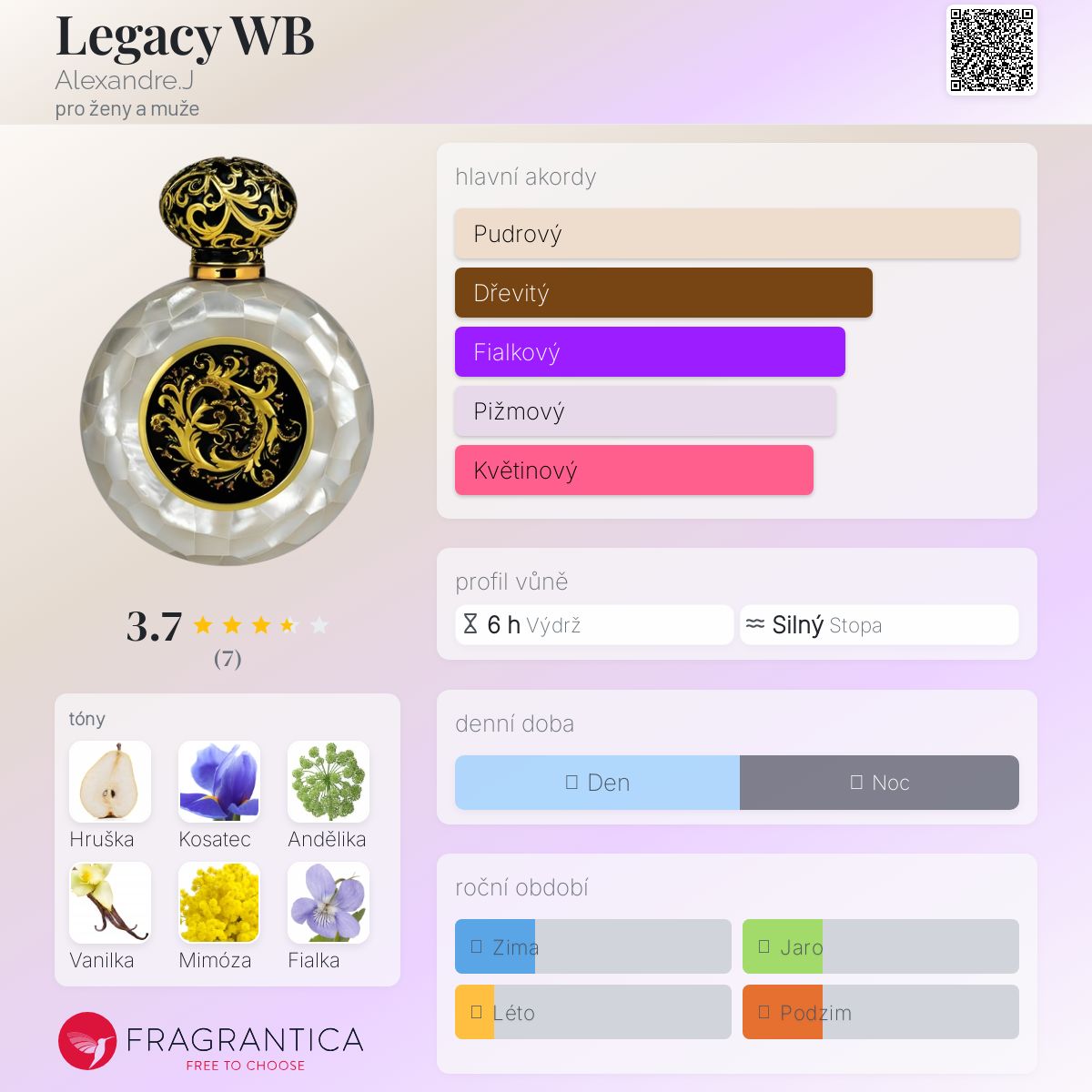 Legacy WB podle Alexandre.J je Floral Woody Musk vůně pro ženy a muže. Legacy WB byl/a uveden/a v roce 2013. Vrchní tóny jsou Andělika a Bergamot; střední tóny jsouHruška, Mimóza a Jasmín ; základní tóny jsou Kosatec, Vanilka, Fialka, Pačuli, Vzácné dřevo, Ambrette (přírodní pižmo) a Santalové dřevo.