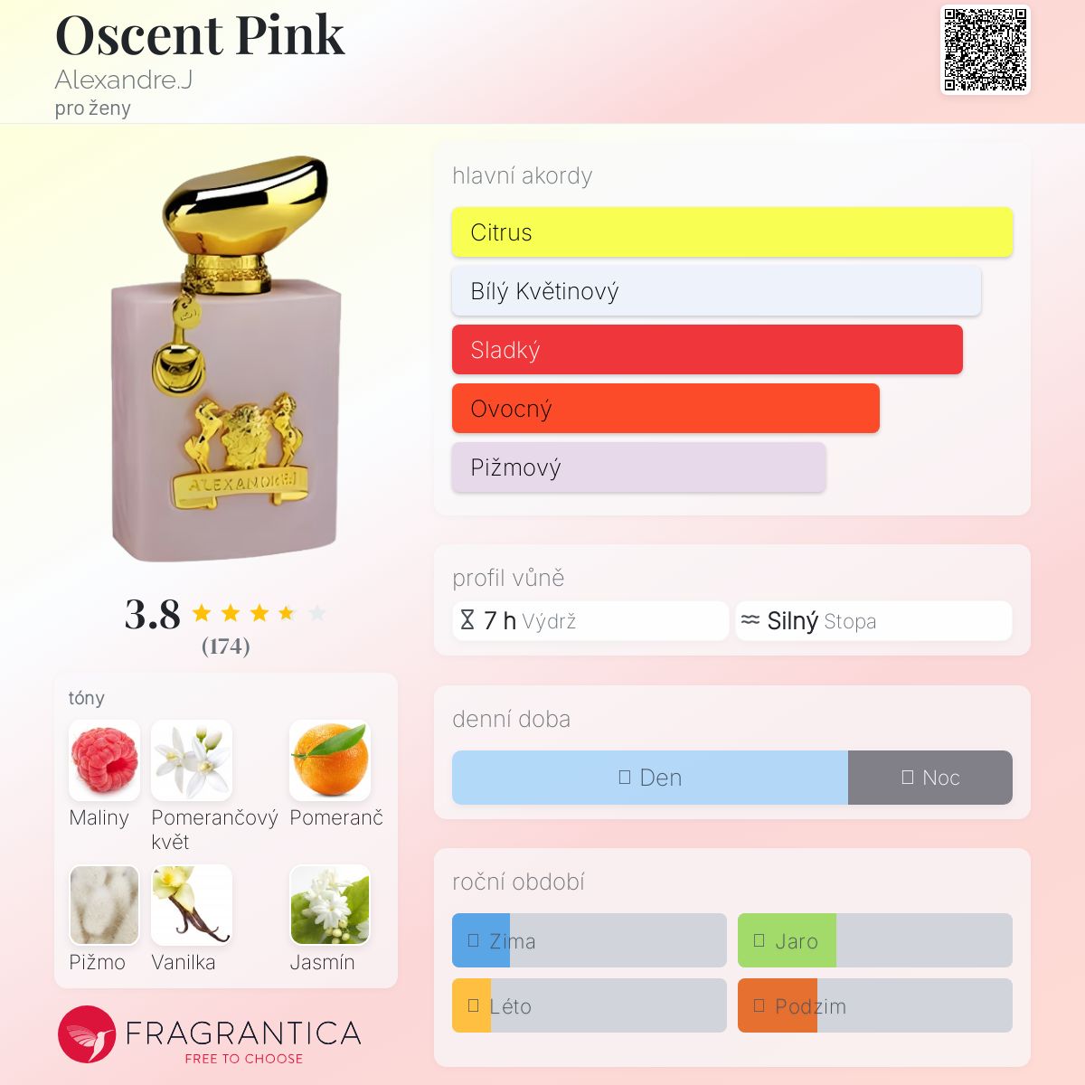 Oscent Pink podle Alexandre.J je Floral Fruity vůně pro ženy. Oscent Pink byl/a uveden/a v roce 2012. Vrchní tóny jsou Maliny, Pomeranč a Bergamot; střední tóny jsouPomerančový květ, Jasmín a Pačuli ; základní tóny jsou Pižmo, Vanilka a Jantar (ambra).