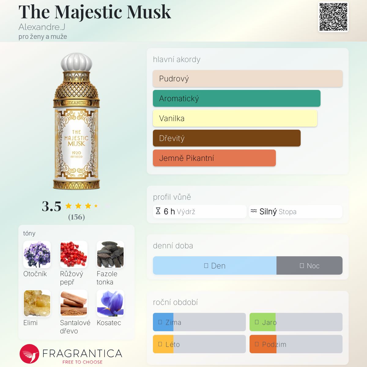 The Majestic Musk podle Alexandre.J je Orientální Spicy vůně pro ženy a muže. The Majestic Musk byl/a uveden/a v roce 2020. The Majestic Musk byl/a vytvořen/a Amelie Bourgeois a Anne-Sophie Behaghel. Vrchní tóny jsou Růžový pepř a Bergamot; střední tóny jsouOtočník, Elimi a Jalovec ; základní tóny jsou Fazole tonka, Santalové dřevo, Kosatec a Semiš.