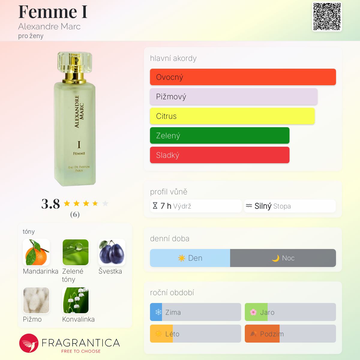 Femme I podle Alexandre Marc je Floral Fruity vůně pro ženy. Femme I byl/a uveden/a v roce 2015. "Nosem" za touto vůní je Alexandre Marc. Vrchní tóny jsou Mandarinka a Zelené listí; střední tóny jsouŠvestka a Konvalinka ; základní tón je Pižmo.