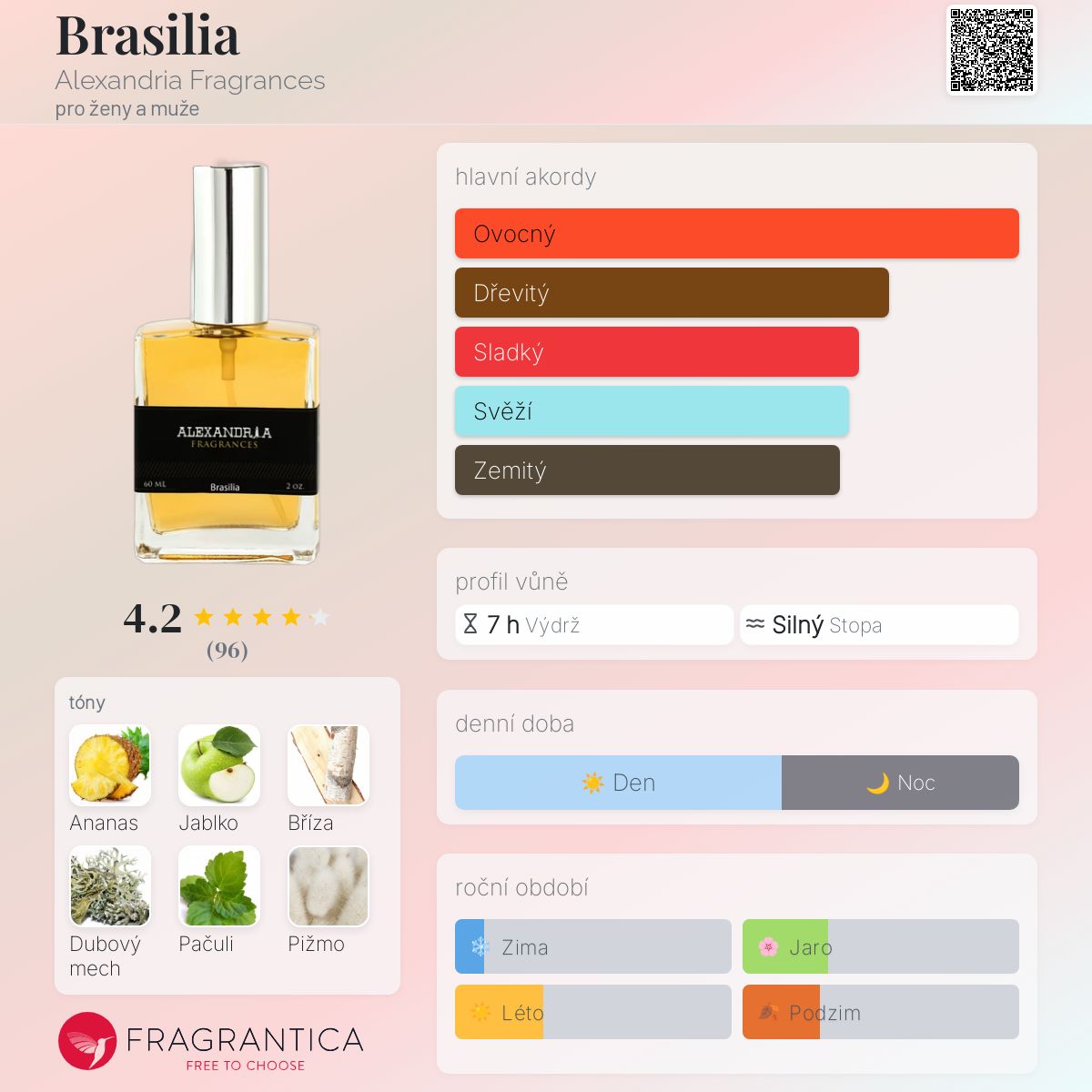 Brasilia podle Alexandria Fragrances je Chypre Fruity vůně pro ženy a muže. Brasilia byl/a uveden/a v roce 2017. "Nosem" za touto vůní je Hany Hafez. Vrchní tóny jsou Ananas, Jablko, Černý rybíz a Bergamot; střední tóny jsouBříza, Pačuli, Růžový pepř a Jasmín ; základní tóny jsou Dubový mech, Pižmo, Ambra a Vanilka.