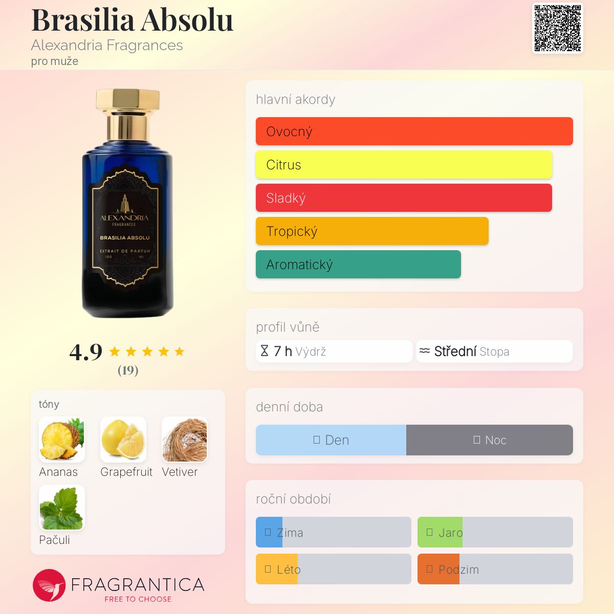 Brasilia Absolu podle Alexandria Fragrances je Aromatic vůně pro muže. Toto je nová vůně. Brasilia Absolu byl/a uveden/a v roce 2024. Vrchní tóny jsou Ananas a Grapefruit; střední tón jeHaitský vetiver ; základní tóny jsou Vetiver a Pačuli.