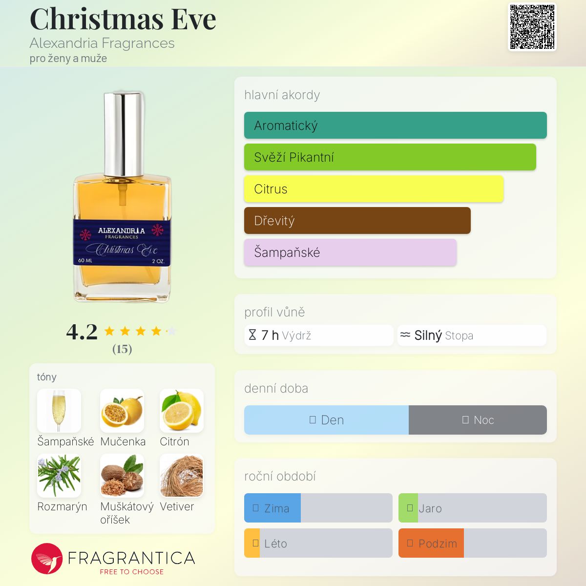 Christmas Eve podle Alexandria Fragrances je vůně pro ženy a muže. Christmas Eve byl/a uveden/a v roce 2017. "Nosem" za touto vůní je Hany Hafez. Vrchní tóny jsou Šampaňské, Mučenka a Citrón; střední tóny jsouRozmarýn a Vetiver ; základní tóny jsou Muškátový oříšek, Růže a Pižmo.