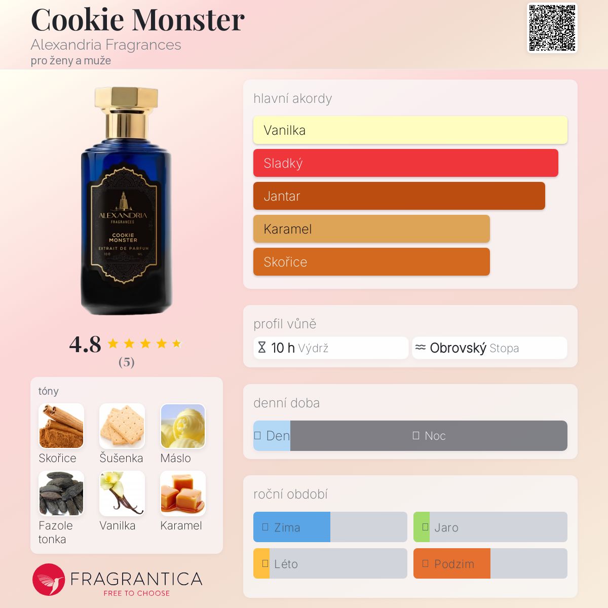 Cookie Monster podle Alexandria Fragrances je Orientální Vanilla vůně pro ženy a muže. Toto je nová vůně. Cookie Monster byl/a uveden/a v roce 2025. Vrchní tóny jsou Skořice, Šušenka, Máslo a Lotus; střední tóny jsouFazole tonka, Vanilka a Karamel ; základní tóny jsou Jantar (ambra) a Pižmo.