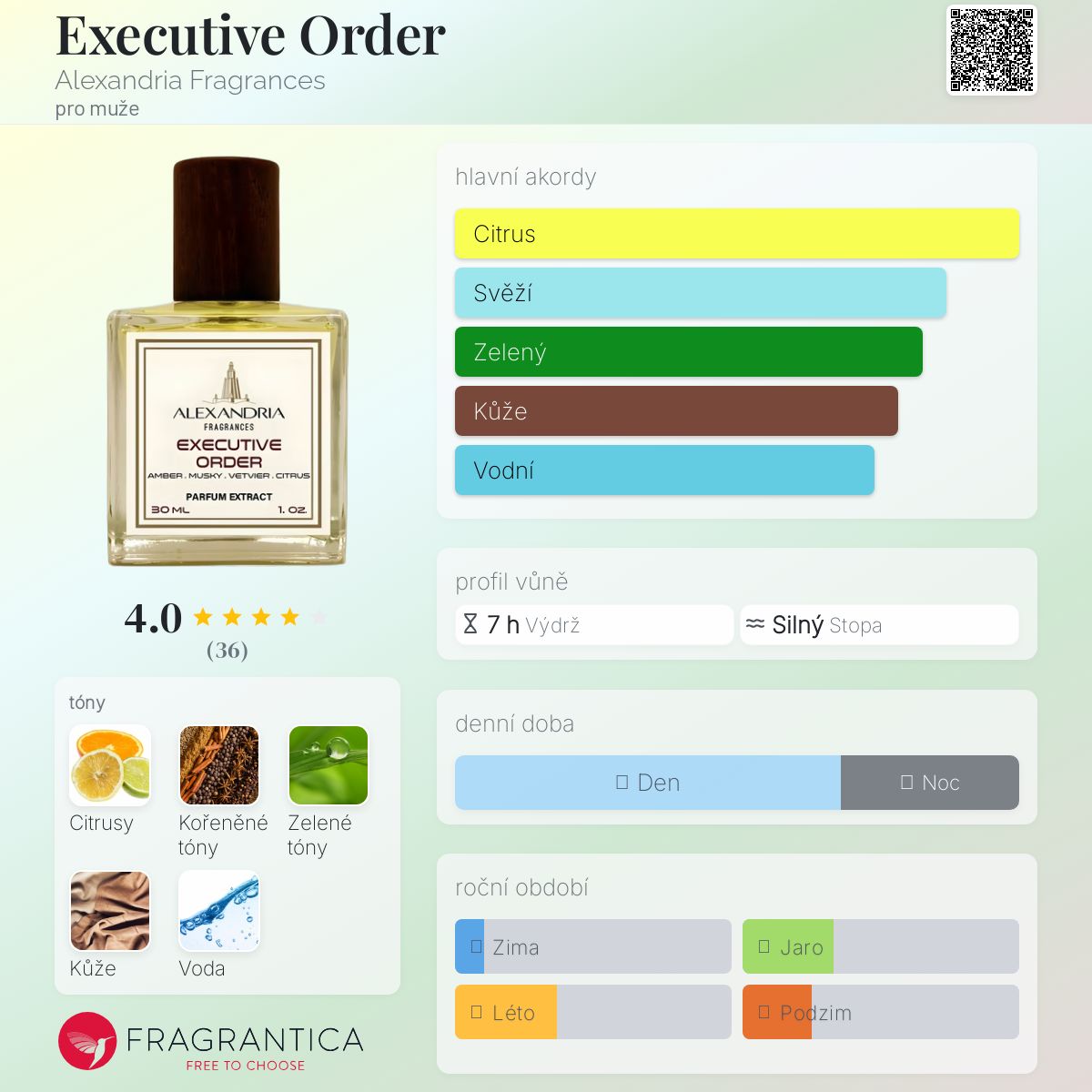 Executive Order podle Alexandria Fragrances je Leather vůně pro muže. Executive Order byl/a uveden/a v roce 2021.