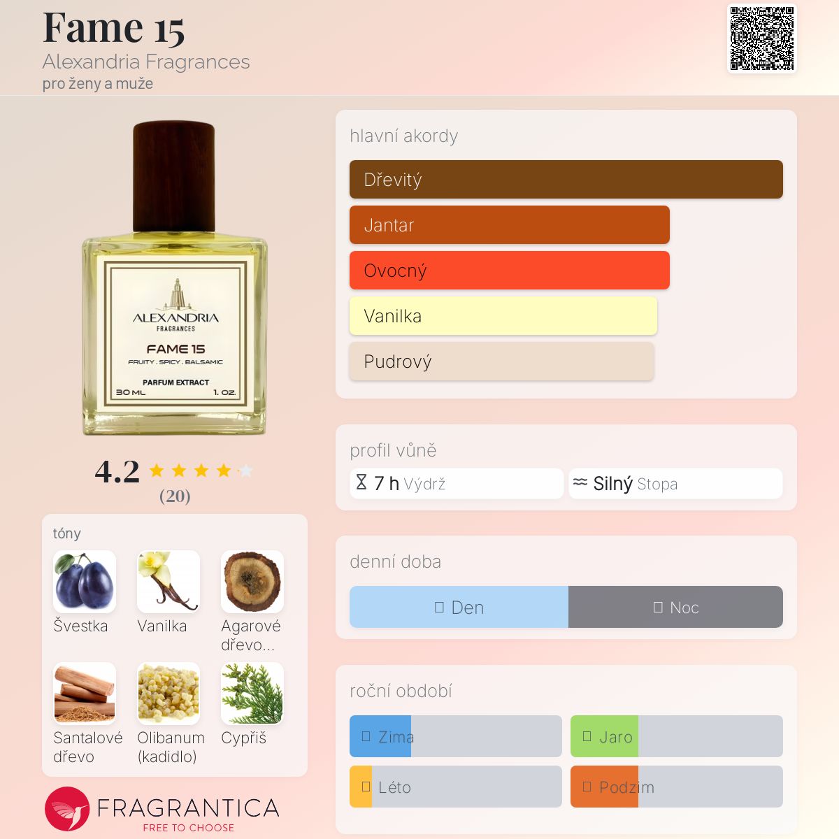 Fame 15 podle Alexandria Fragrances je Orientální vůně pro ženy a muže. Fame 15 byl/a uveden/a v roce 2021. Vrchní tóny jsou Švestka, Cypřiš, Bergamot a Citrusy; střední tóny jsouAgarové dřevo (oud), Pačuli, Labdanum a Jasmín ; základní tóny jsou Vanilka, Santalové dřevo, Olibanum a Pižmo.