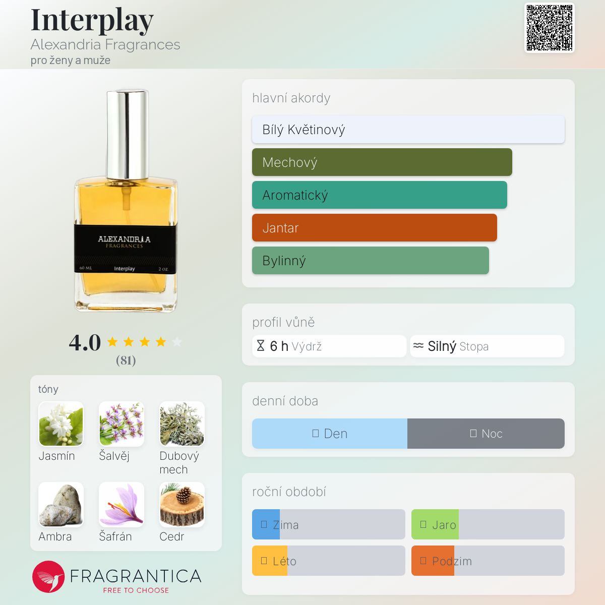 Interplay podle Alexandria Fragrances je Orientální Floral vůně pro ženy a muže. Interplay byl/a uveden/a v roce 2017. "Nosem" za touto vůní je Hany Hafez. Vrchní tóny jsou Jasmín a Šafrán; střední tón jeAmbra ; základní tóny jsou Šalvěj, Dubový mech a Cedr.