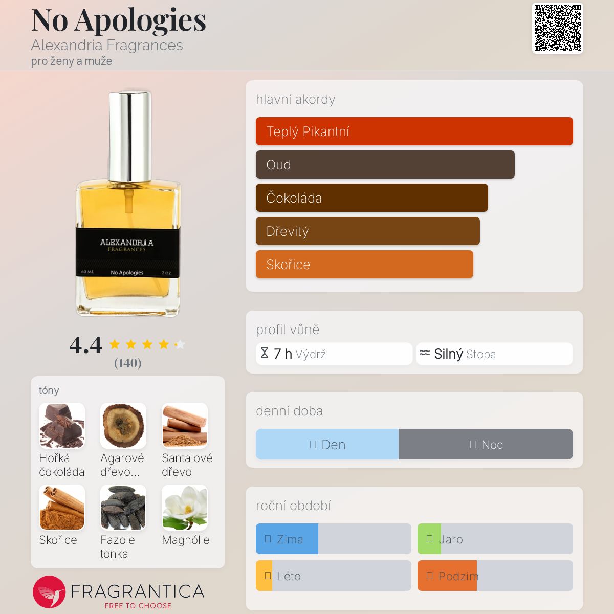 No Apologies podle Alexandria Fragrances je vůně pro ženy a muže. No Apologies byl/a uveden/a v roce 2017. "Nosem" za touto vůní je Hany Hafez.