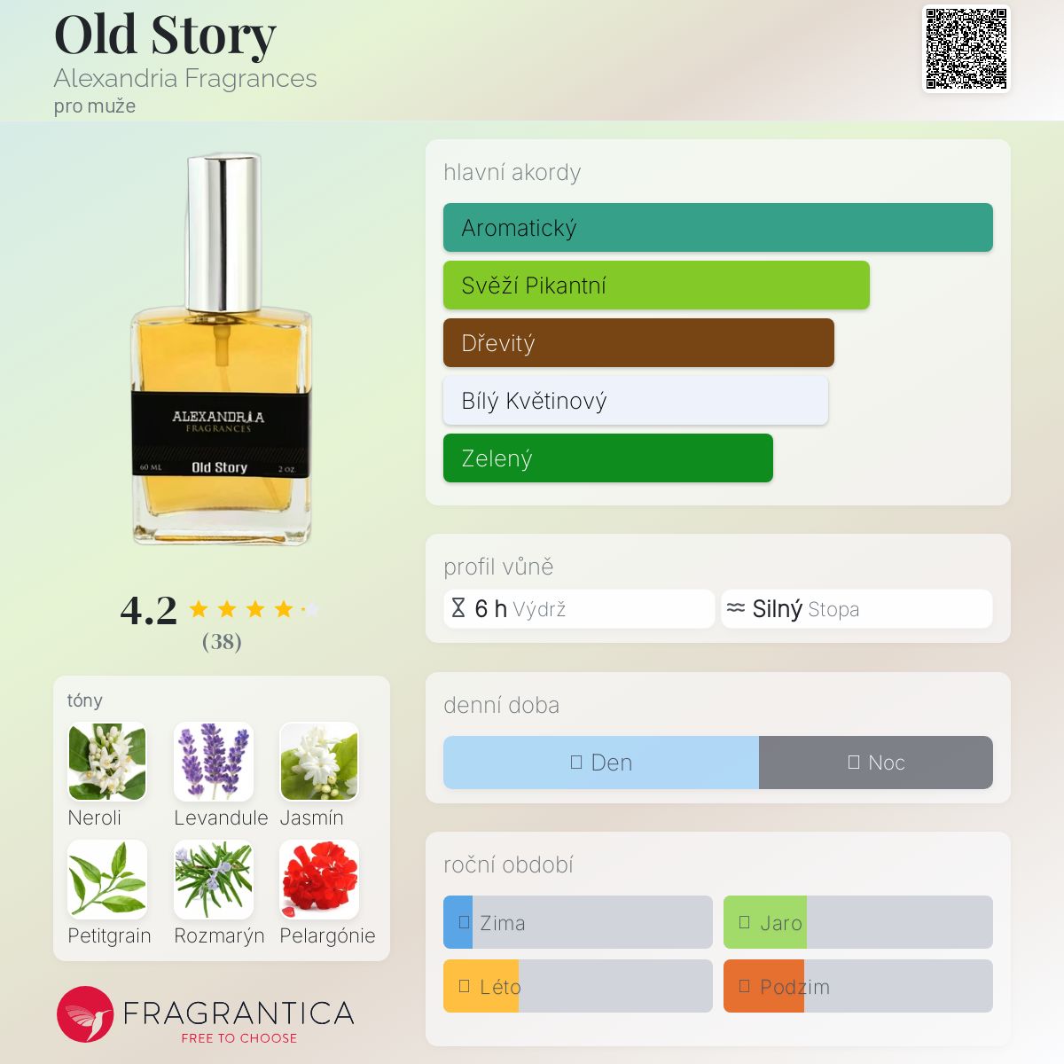 Old Story podle Alexandria Fragrances je Woody Floral Musk vůně pro muže. Old Story byl/a uveden/a v roce 2017. "Nosem" za touto vůní je Hany Hafez. Vrchní tóny jsou Neroli, Levandule, Petitgrain a Rozmarýn; střední tóny jsouJasmín, Pelargónie, Galbanum a Šalvěj muškátová ; základní tóny jsou Jantar (ambra), Vetiver, Santalové dřevo, Dub a Cedr.