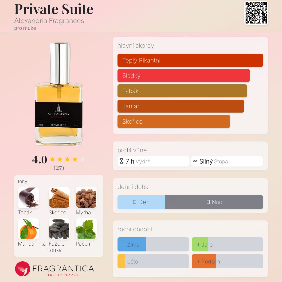 Private Suite podle Alexandria Fragrances je vůně pro muže. Private Suite byl/a uveden/a v roce 2019. "Nosem" za touto vůní je Hany Hafez.